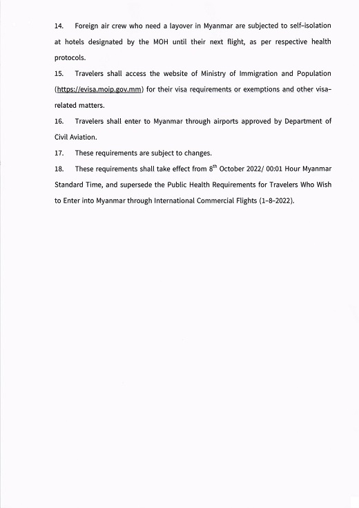 Public Health Requirements For Travelers Entering Myanmar Through Commercial Flights (news on 12 Oct 2022)